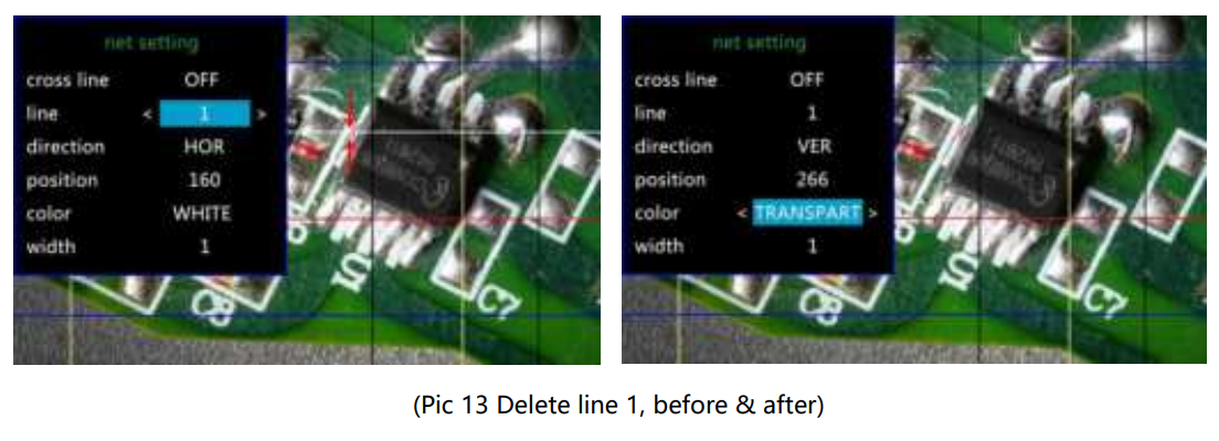 Use “Up” and “Down” to choose among “Cross Line”, “Line”, “Direction”, “Location”, “Color”, and “Wide”. Use “Left” and “Right”(marked as a brightness +&- in pic 8) to change settings. The microscope can’t do this mission alone. The remote is needed. A cross line, as its name says, it’s a pair of vertical and horizontal lines located in the very middle of the