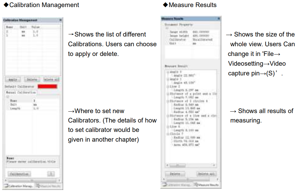 - Calibration Management and Measuring Results: These two windows are located in the same place, and users can switch between them by clicking.