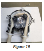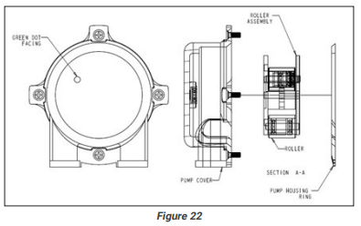 - Install roller assembly with Tube, make sure recessed portion indicated by a color dot faces down into the pump housing. (Figure 18, 19)
