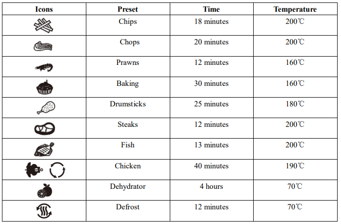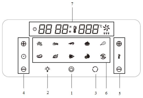 Temperature control buttons enable you to raise or lower cooking temperature by 5℃ starting from 80℃ to 200℃ under normal conditions, 30℃ to 80℃ under preset function on dehydrator, and 40℃ to 70℃ under preset function on defrost.