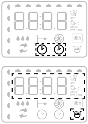 The main screen displays the volume of water in liters (or gallons) that will be treated by the softener before the next automatic regeneration. On average, an adult spends 280 liters of water per day. The volume of water until the next water regeneration is indicated in hundreds or thousands of liters, depending on the value. For example, the number 33 would mean 33,000 l if x 1000 is shown on the display at the same time, and 3300 l if this indicator is inactive.