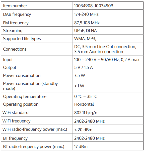 Importer for Great Britain: Berlin Brands Group UK Limited PO Box 42 272 Kensington High Street London, W8 6N, D United Kingdom. Hereby, Chal-Tec GmbH AUNA 10034908 IR-260 Internet Radio declares AUNA 10034908 IR-260 Internet Radio that the radio equipment type MM-5.1-JW complies with Directive 2014/53/EU. The full text of the EU declaration of conformity is available at the following internet address: use.berlin/10022256