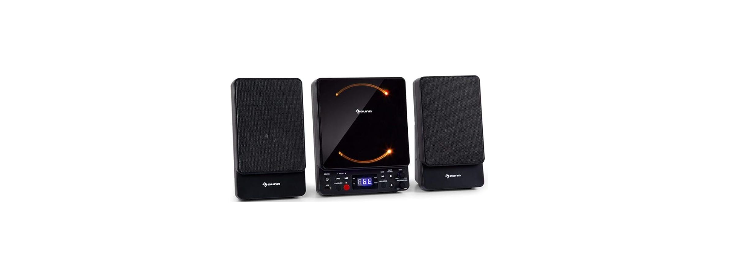 For contemporary environments, the AUNA Microstar is a small, all-in-one vertical stereo system. It has built-in speakers, a wall-mountable design, and the ability to play music via CDs, USB, Bluetooth, and FM radio.