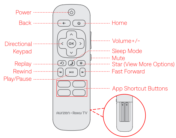 - Power your remote by inserting 2 AAA batteries (not included), carefully matching (+) and (- indicated inside the battery compartment.