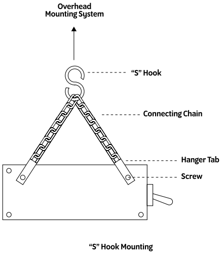 - Carefully lift the unit and attach the “S” hooks on each end of the unit to the overhead mounting system. Ensure the unit is level. See diagram for reference.