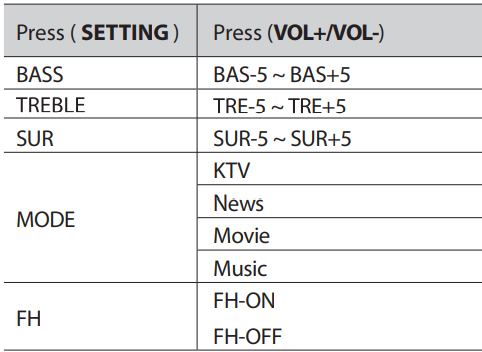 1. Pressthe SETTING button repeatedly to select the sound menu to be adjusted: BASS, TREBLE, SUR, MODE, FH. Press VOL+/VOL— to change the sound level.AWOL-VISION-ThunderBeat-Home-Theater-Sound-System-FIGURE-15