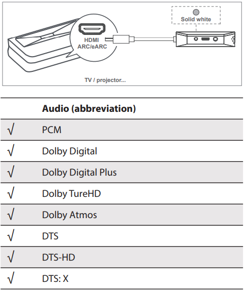 1. Connect the Dongle’s HDMI input plug to the Projector/TV/Laser TV’s HDMI ARC/eARC port; the Dongle enters the HDMI eARC mode by default.AWOL-VISION-ThunderBeat-Home-Theater-Sound-System-FIGURE-16