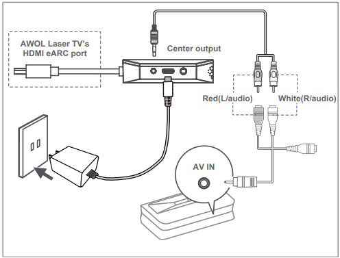 2. Connect Dongle’s HDMI input plug to the AWOL Laser TV’s HDMI eARC port. Select the route by remote control, Settings-Sound-Output device-HDMI eARC-Open” Center Speaker.”AWOL-VISION-ThunderBeat-Home-Theater-Sound-System-FIGURE-19