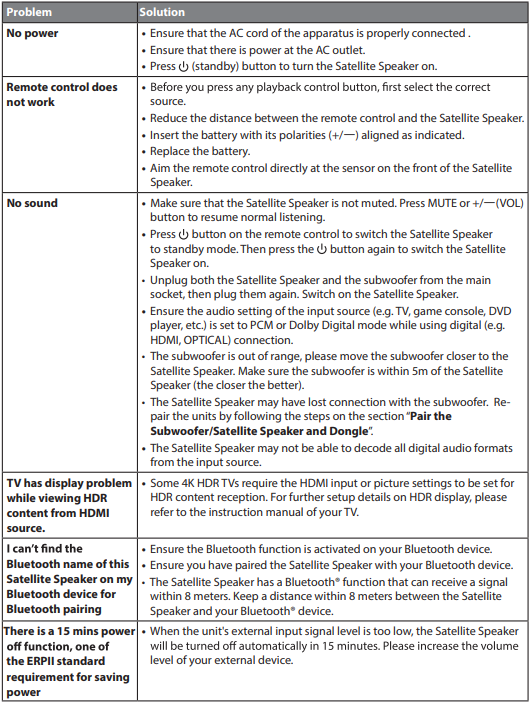 To keep the warranty valid, never try to repair the system yourself. If you encounter problems when using this Satellite Speaker, check the following points before requesting service.