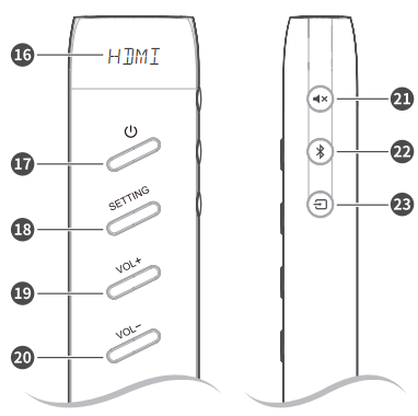 Press the # (SOURCE) button repeatedly on the remote control to select the HDMI eARC, AUX, USB, and $ (Bluetoothmodese. The selected mode will show on the display.