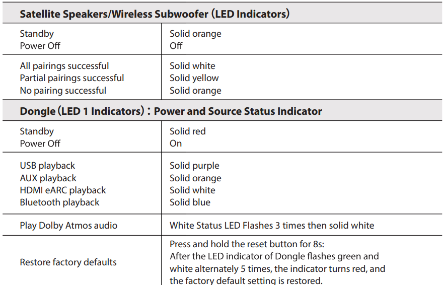 • Determine the status based on the Wireless Subwoofer or Satellite Speaker indicator.AWOL-VISION-ThunderBeat-Home-Theater-Sound-System-FIGURE-14