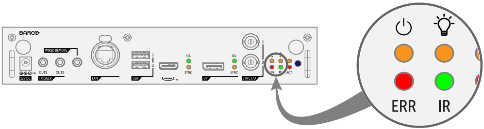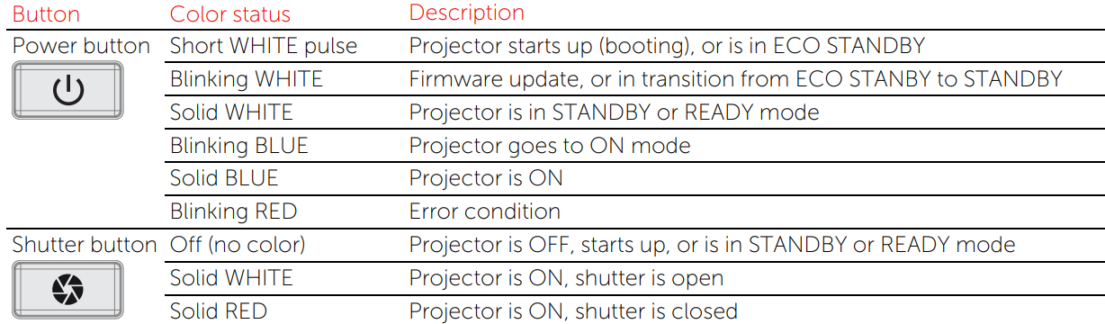 The Control & Communication module contains four status LEDs on the right side of the front panel. These LEDs allow a quick status analysis of the projector. For explanatory see the table hereunder.