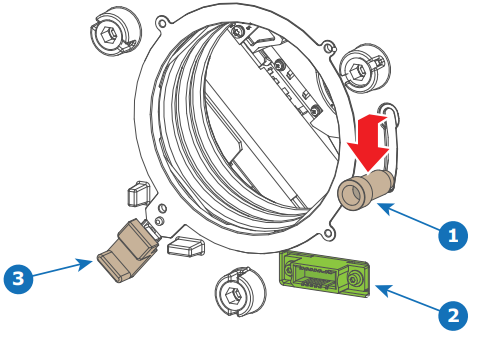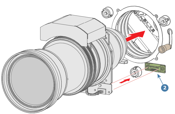 - Gently insert the projection lens in the lens holder while aligning the lens connector with the electrical socket (reference 2) until a click is heard.