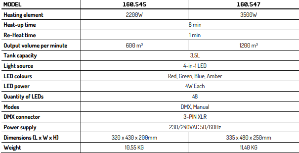 The two types are intended to be vertical foggers. For stage effects, they may safely release fog straight upward, forming a thick column of vertical fog.