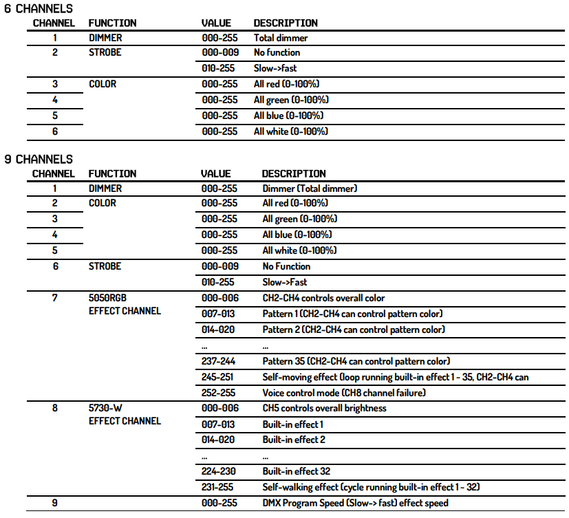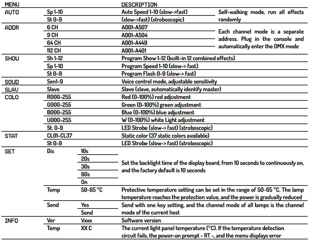 Auto Mode: Pre-programmed colour and strobe patterns are used by the strobe. Sound Mode: The strobe responds to sound input through the integrated microphone or ambient music. DMX Mode: Managed from a distance with a DMX controller. To switch between modes, press the mode button on the control panel.