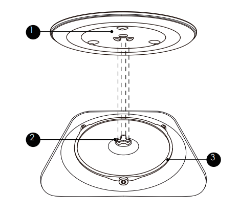 How to put the turntable in place: 1. Place the turntable in the assembly ③ into the recess in the cooking compartment. 2. Place the glass tra ① on the turntable ring assembly ③. Fit the raised, curved lines in the center of the glass tray bottom between the three spokes of the shaft. Make sure that the glass tray ① engages in the turntable shaft ② in the centre of the cooking compartment floor. The rollers on the ③ should fit inside the turntable bottom ridge.