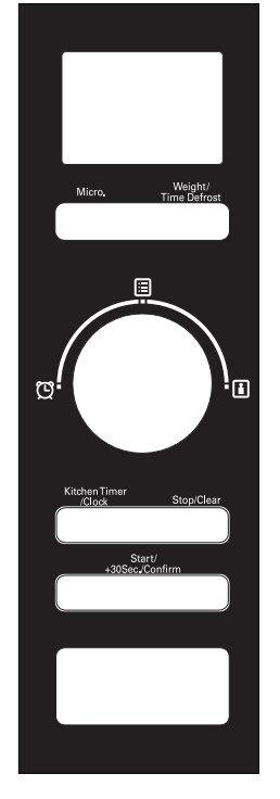 - Press ” ” to start cooking, and the buzzer will sound once for Start/+30Sec./Confirm e first section, defrosting time counts down; buzzer will sound once again entering the second cooking. When cooking finishes, the buzzer sounds five times.