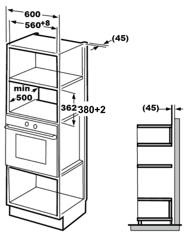 If the plug is no longer accessible following installation, an all-pole isolating switch must be present on the installation side with a contact gap of at least 3mm. The fitted cabinet must not have a back wall behind the appliance. Minimum installation height: 85cm. Do not cover ventilation slots and suction holes.
