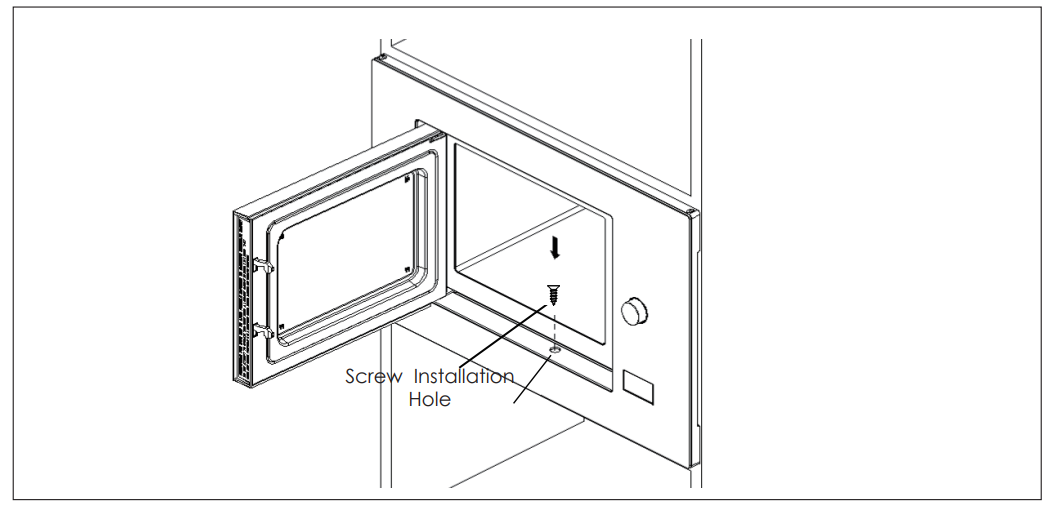 - Open the door, fix the oven to the cabinet with the Screw at the installation hole.