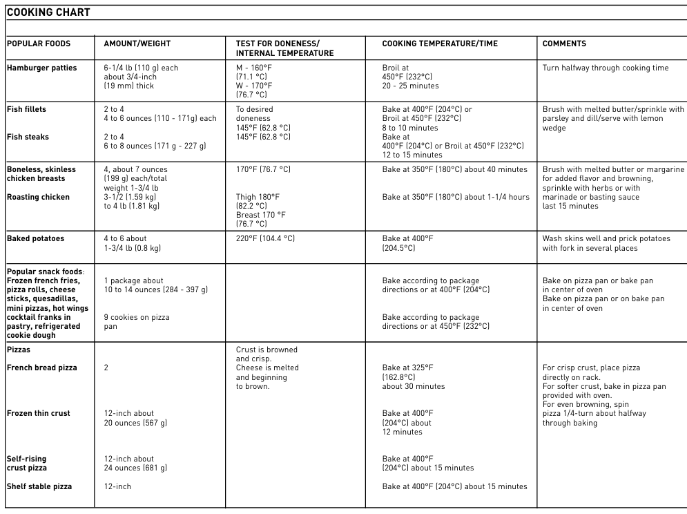 - If using convection bake, remember to lower the suggested temperature of a recipe or package by 25˚F.