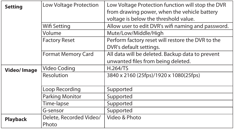 • Resolution : Front 8MP 4K 3840 x 2160 (25fps) Rear 2MP FHD 1920×1080 (25fps) Interior 2MP FHD 1920×1080 (25fps)