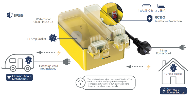 Ans: Indeed. The adaptor has a built-in circuit breaker that protects your house and caravan electrical systems by cutting power if the current reaches unsafe levels.