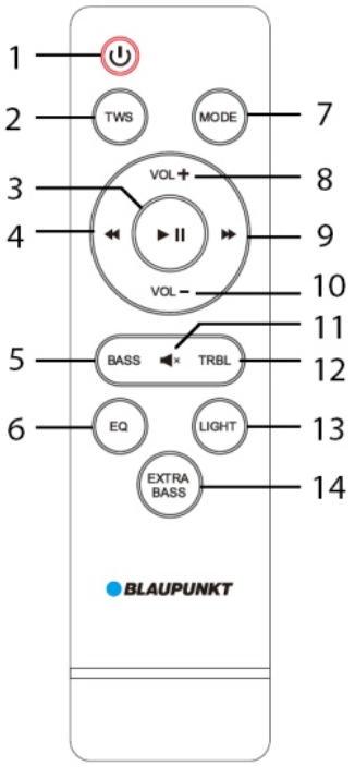 Select a music and play it on the outsourcing player, then the sound will output from the speaker. In line-in playback mode, the main control is on the outsourcing BLAUPUNKT PB100X Party Box System player side. But you can also control the volume, mute the sound, and adjust treble & bass, etc. on the speaker side.