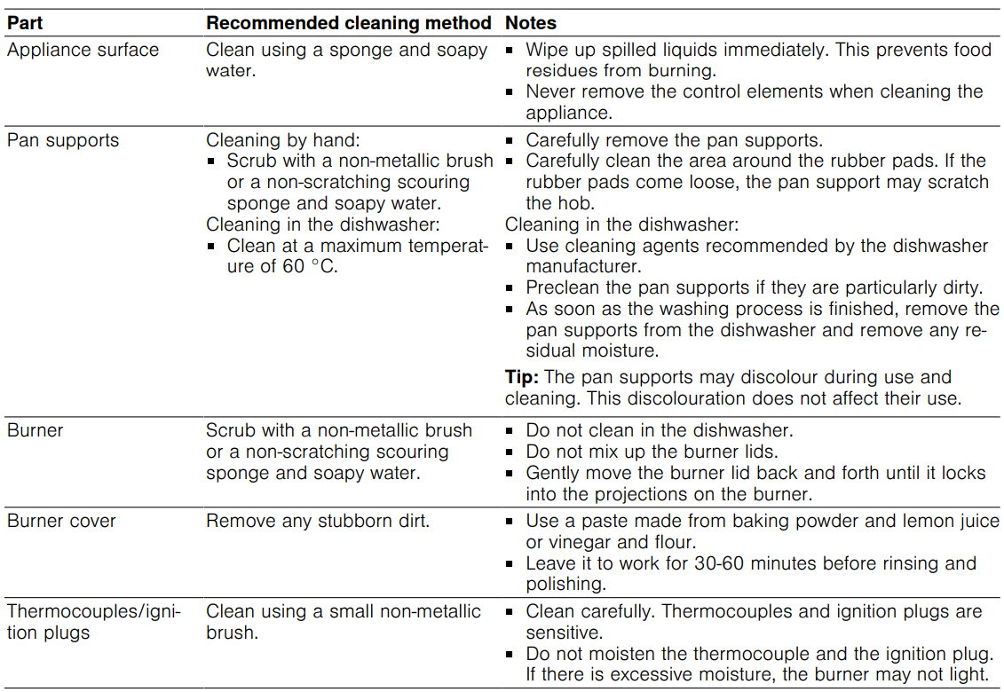 Clean all parts of the appliance after each use. Note: Read the Bosch PNK6B.K4.A Built-In Gas Hob provides information on the cleaning agents. “Cleaning product”, Page 13