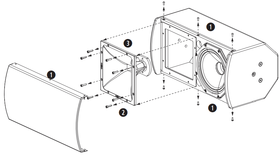 - Remove the screws (AMU108 and AMU108-120: 6 screws; AMU206, AMU208, and AMU208-120: 8 screws) from around the loudspeaker grille and remove the grille from the enclosure.