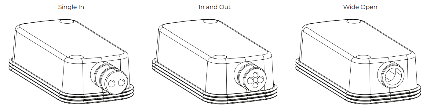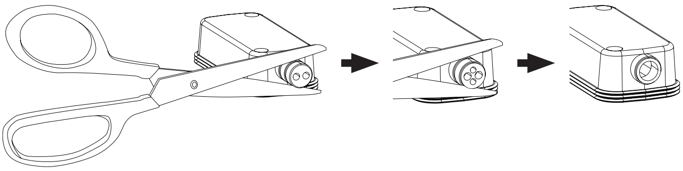 The weather-resistant input cover is designed for three different wiring scenarios (see above). To change the configuration of the input cover to support your wiring scenario, cut along the perforation on the rubber conduit.