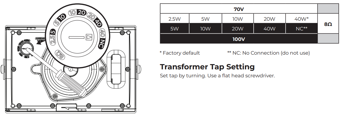 - Current or Power: (70V): 2.5W, 5W, 10W, 20W, 40W; (100V): 5W, 10W, 20W, 40W