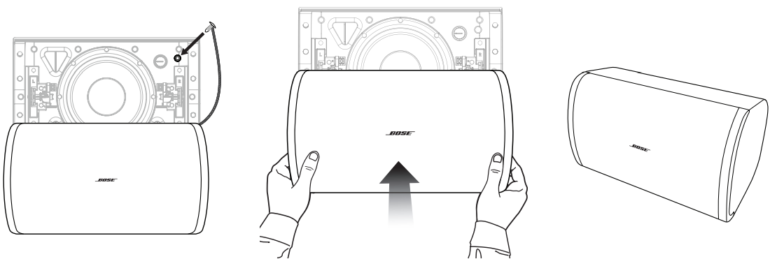 Insert the safety lanyard pin into the lanyard pin hole in the loudspeaker. Using both hands, position the grille against the loudspeaker, ensuring the grille is flush against the loudspeaker with no gaps. The grille secures to the loudspeaker magnetically.