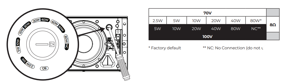 • Current or Power: (70V): 2.5W, 5W, 10W, 20W, 40W, 80W; (100V): 5W, 10W, 20W, 40W, 80W