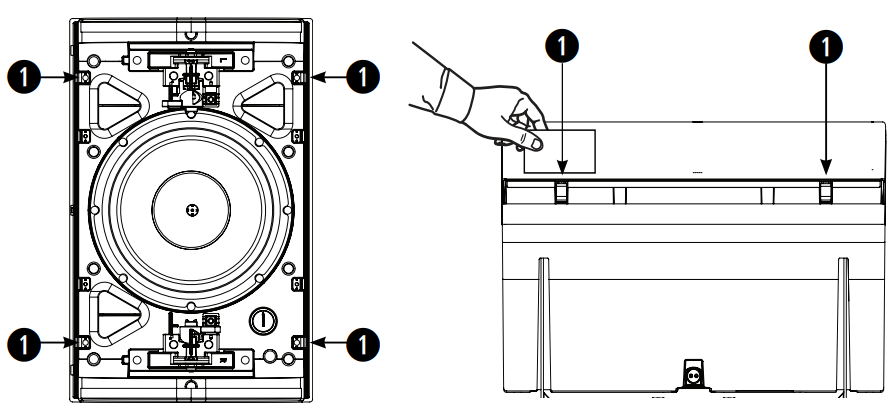 There are four small openings on each corner of the grille (1). Along the side of the loudspeaker, insert a small, flat tool into the grille openings to disengage the release tabs. Pull the grille