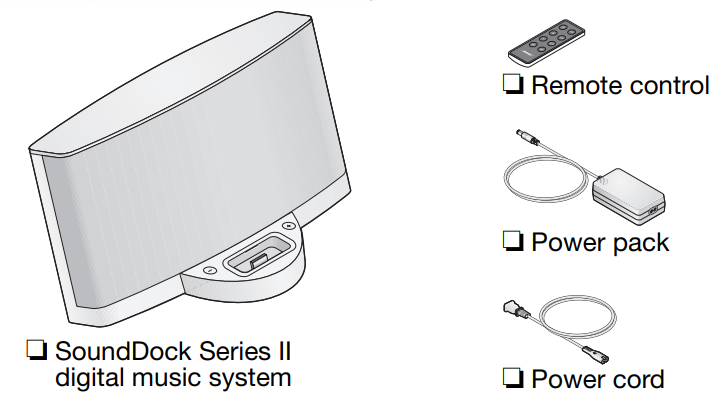Congratulations on your choice of the SoundDock® Series II digital music system from Bose. Designed specifically to work with your iPod or iPhone, this system provides high-quality audio performance that invites your music to come out and play. Whether the music is from your iPod/iPhone or from another connected device, you’ll find that it attracts a wide audience of people who love the sound.