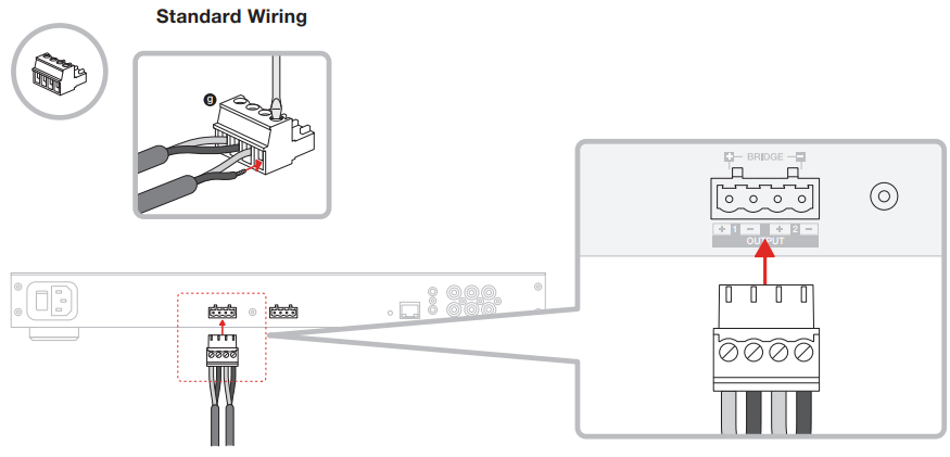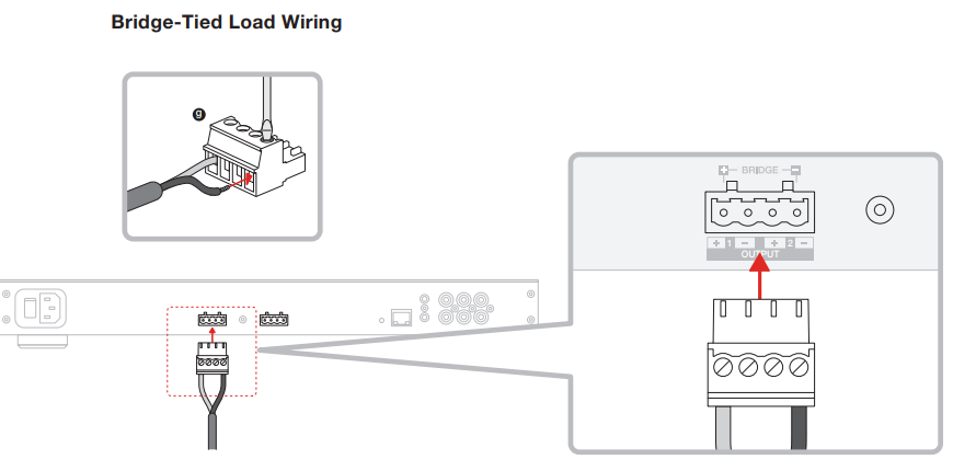 The two terminals for a bridged pair of speakers are marked by + BRIDGE –. In bridge mode, both amplifiers in the zone combine to make a mono output of double the power. The minimum load impedance in bridge mode is 8Ω. Connecting 4Ω loads may result in lower output power, distortion, and overheating.