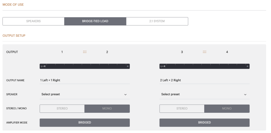- Highly flexible usage/configuration – Left/Right outputs can be bridged to provide a mono output of double the power at 250 watts.