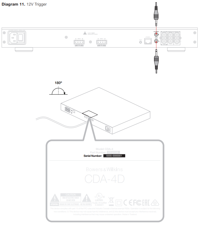 In this mode, CDA-4D will turn on when a 12V signal is present on the 12V Trigger Input. This 12V trigger input can be wired to the 12V trigger output from an audio matrix switch or a relay.
