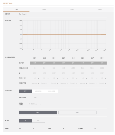 - To apply the EQ and Crossover configuration made on the channel, click Save before moving to the next tab. To restore the default setting or clear the settings made to this section, click the Reset button.