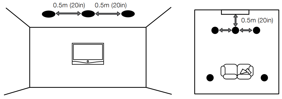 The centre speaker should be on the centre line of the screen, and the front speakers should be each laterally within approximately 0.5m (20 in) of the sides of the screen. Surround channel CCM3 Series speakers should be located just behind and to either side of the listening position. Try to avoid corner locations for any of the speakers and ensure that the acoustic environment around each front and surround speaker is similar.