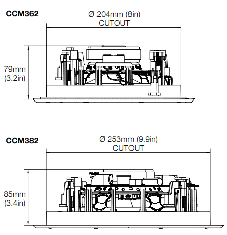 CCM3 Series speakers require ceiling aperture and height clearance dimensions described in the following table: