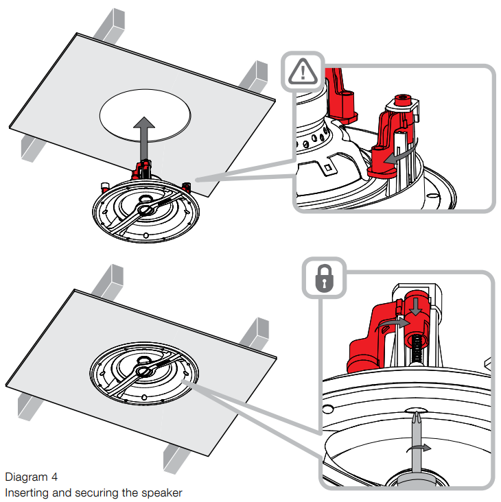 Take great care not to damage the speaker drive units with the screwdriver. Engage the screwdriver with each dog-clamp screw in turn and tighten them. Diagram 4 illustrates inserting and securing the speaker.
