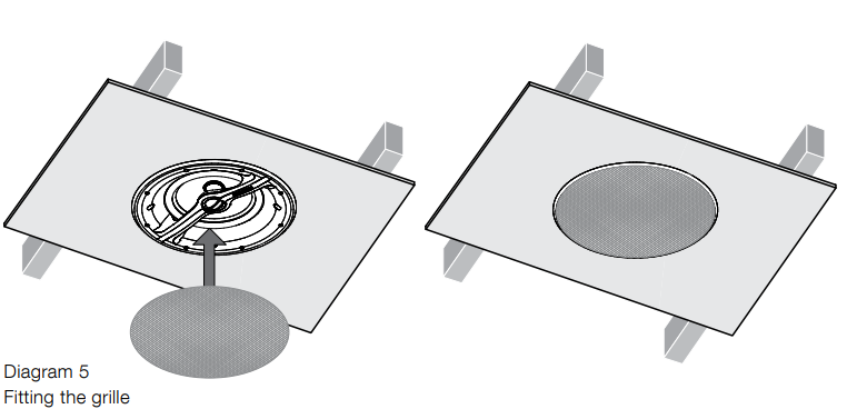 The grille is placed magnetically, so it simply needs to be aligned with the groove in the frame flange, where it will click into place. Diagram 5 illustrates fitting the grille.