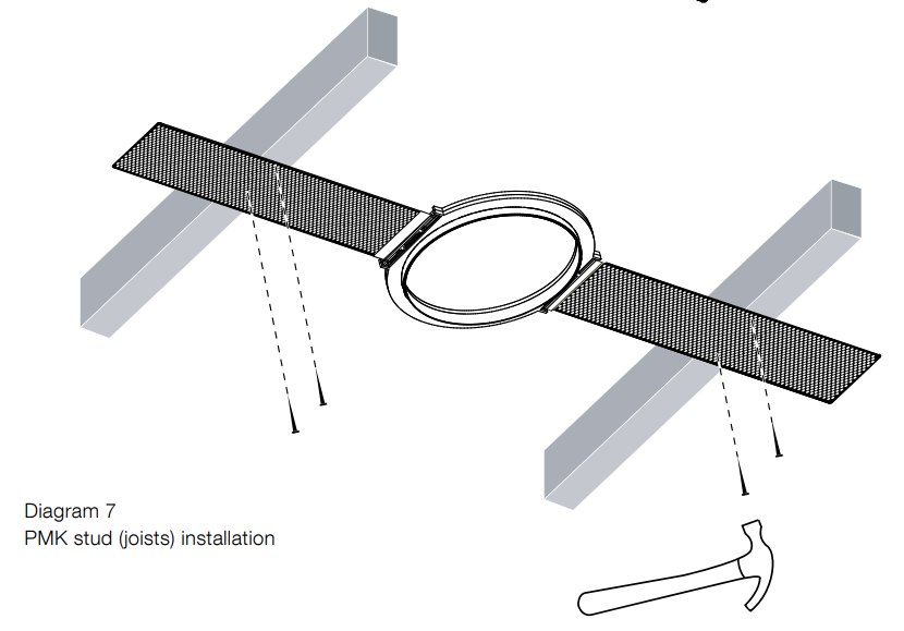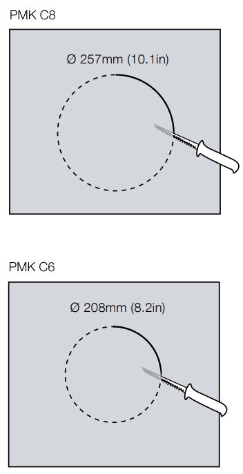 When the sheetrock (plasterboard) is subsequently fitted (marked on the outside to denote the position of the pre-mount kit), the PMK plastic moulding serves as an internal cut guide that significantly eases cutting the speaker aperture. Diagrams 6 to 9 illustrate the PMK installation.
