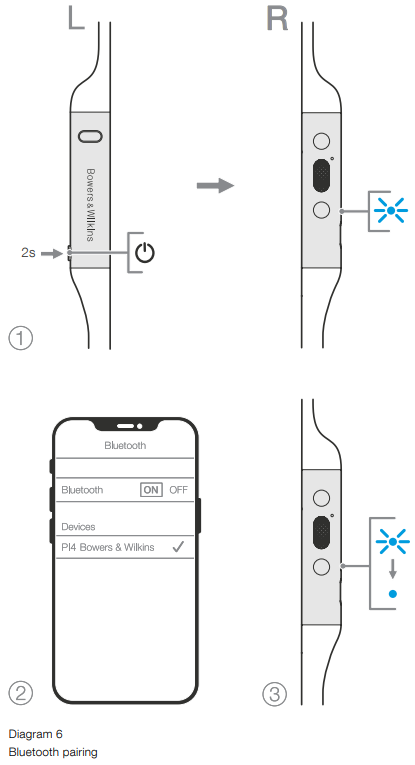 Press and hold the multi-function button until the LED glows blue. Then pick “Bowers & Wilkins PI4” from your device’s Bluetooth menu.