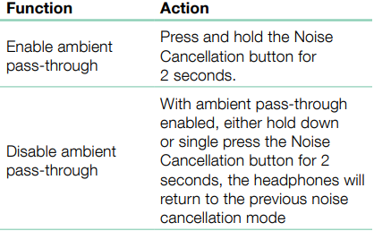 - Ambient Pass-Through enables external sounds, such as conversation or safety announcements, to be heard clearly without any need to remove the headphones.