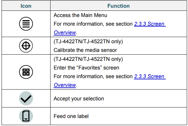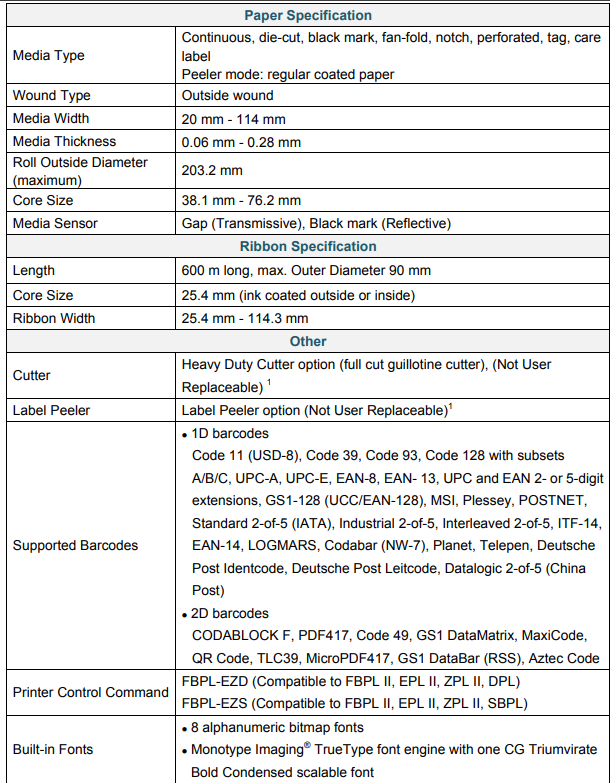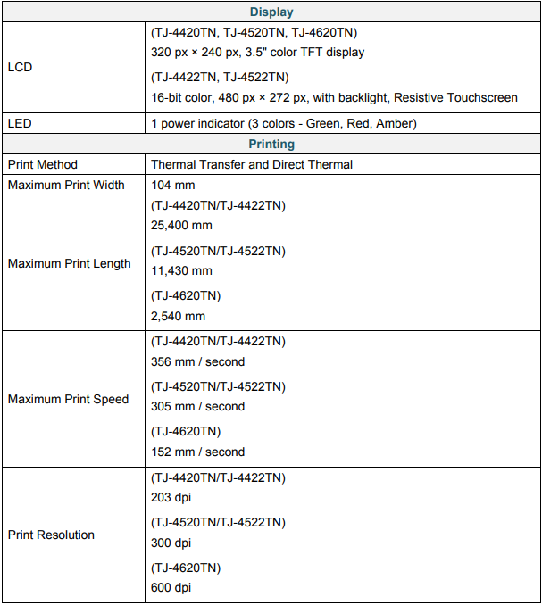 (PA-WB-001)) - 16-bit Color Touchscreen (TJ-4422TN/TJ-4522TN only) The label printer uses its high-performance and high-quality built-in Monotype Imaging® TrueType font engine with the CG Triumvirate Bold Condensed smooth scalable font. It also provides a choice of eight different sizes of the alphanumeric bitmap font and supports most of the standard barcode formats.