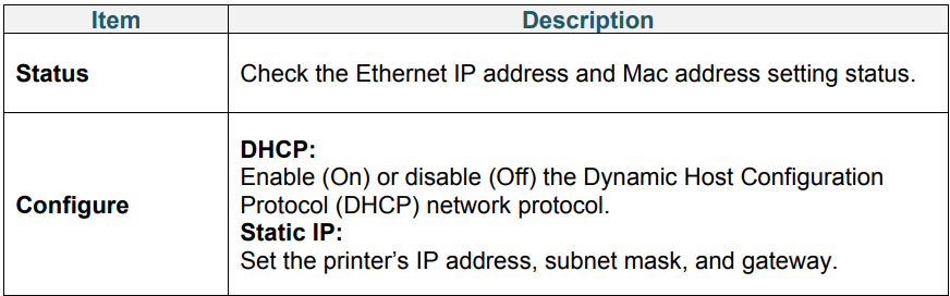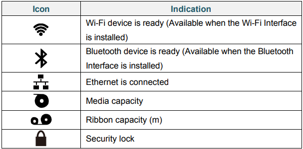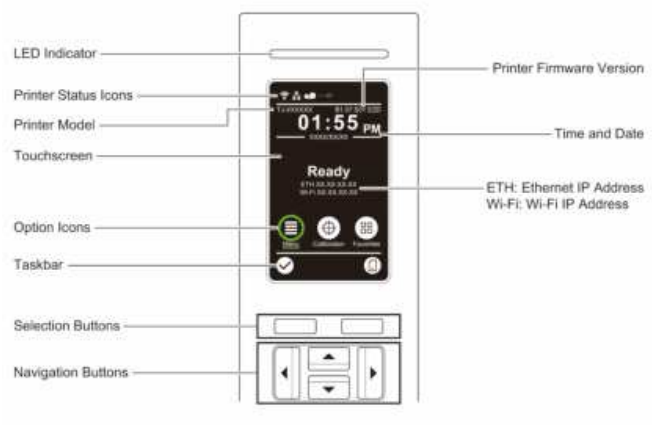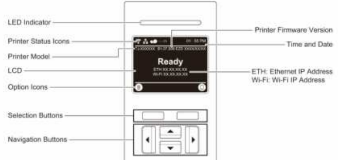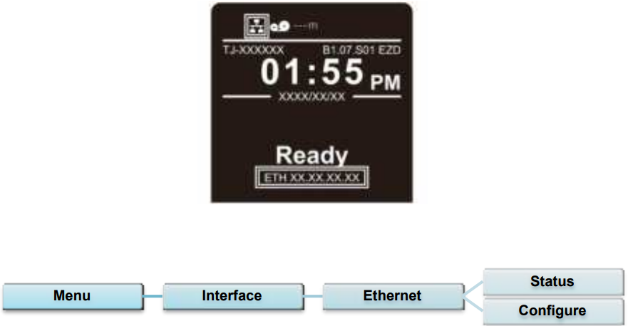Configure your printer’s Ethernet (wired) connection and check its status. When the Ethernet is connected, the Ethernet icon and IP address appear on the screen as shown below.