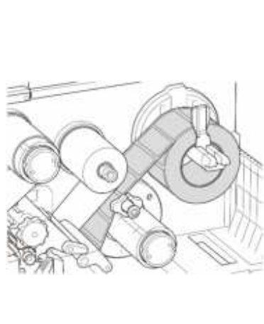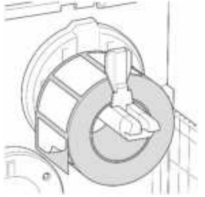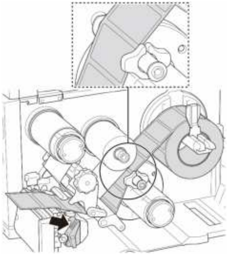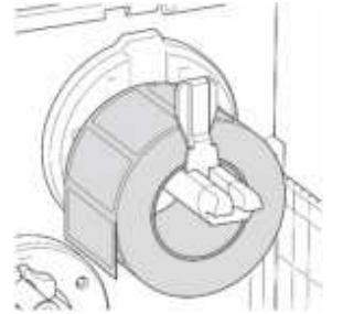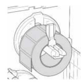- Place the label roll on the Label Supply Spindle and then flip the Label Roll Guard upwards to hold it in place.