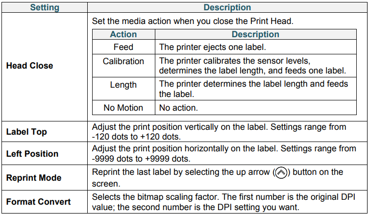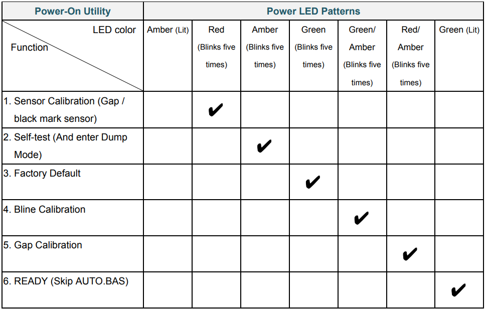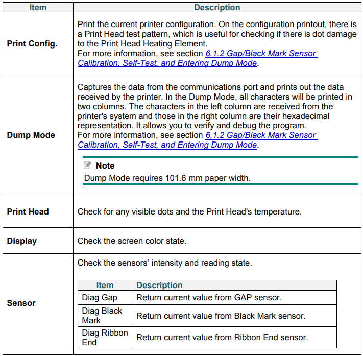 Calibrate the Gap or Black Mark Sensor if the sensor’s settings used in the last print job are not suitable for the current print job. During the calibration of the Gap/Black Mark Sensor, the printer detects the label length, prints the internal configuration (self-test), and then enters Dump Mode. To calibrate the Gap/Black Mark Sensor